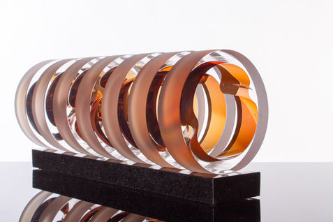 Phil Vickery´s work conceptualises the natural power behind thought. Employing abstract forms to investigate the duality between conscious decision making and the subconscious. The mind acts in a segmented way. Phil Vickery uses molten glass and cold-working to show this orderly fracture. Each segment of the sculpture acts as a metaphorical building block or thought, but viewing the sculpture as a deconstructed whole infers the disrupted flow between thought and actuation.